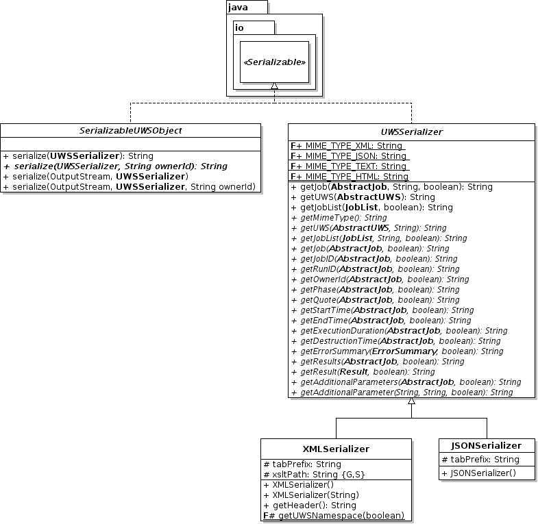 The class UWSSerializer is the abstract class used to define the serialization of any UWS resource in a given format. XMLSerializer and JSONSerializer correspond respectively to the XML and the JSON formats.